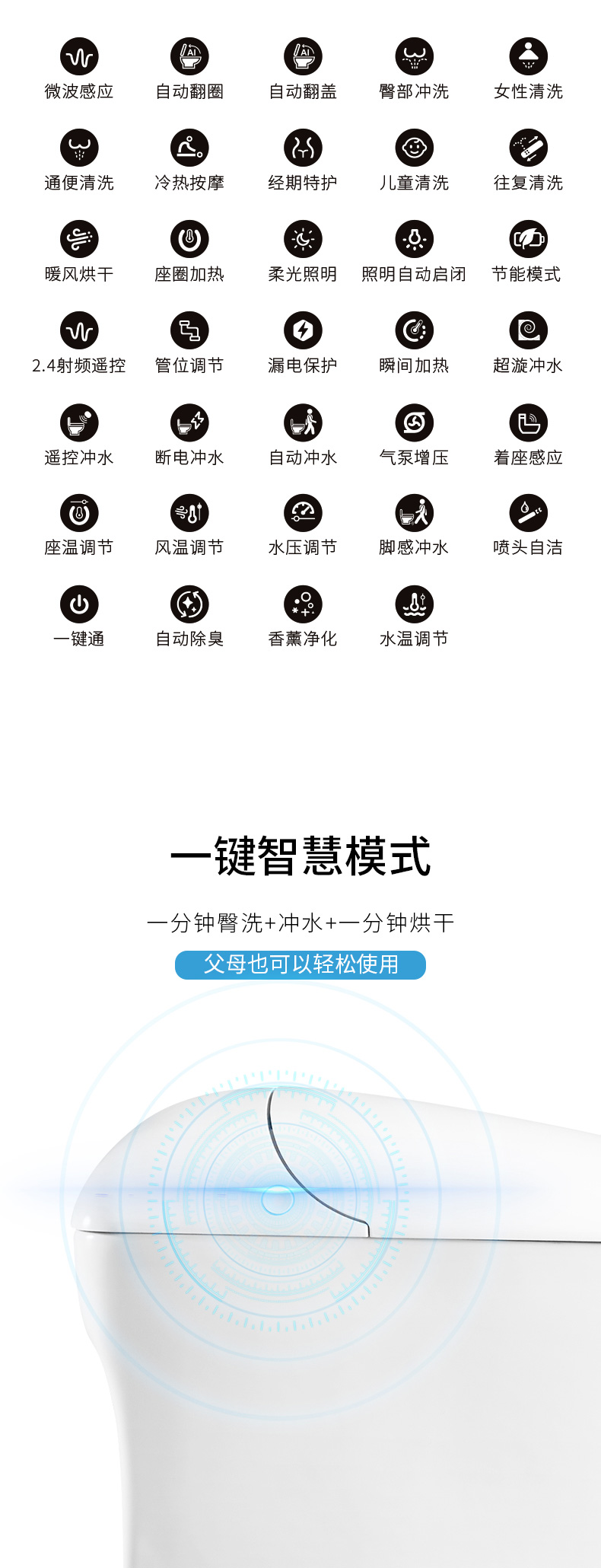 產(chǎn)品功能:1、微波感應(yīng)、自動翻蓋/翻圈、